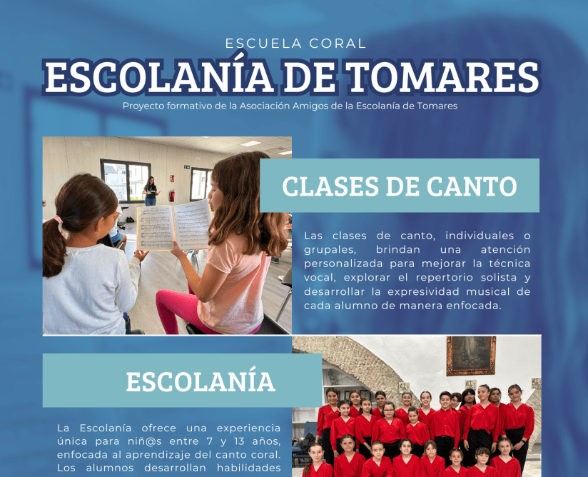 La ESCUELA CORAL ‘Escolanía de Tomares’ es un proyecto formativo en el que impartimos clases de canto, tanto individuales como grupales, además de la posibilidad de participar en nuestros dos coros.